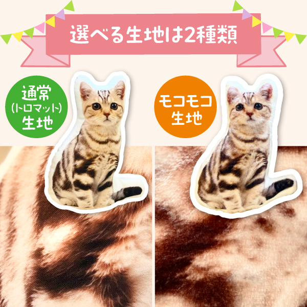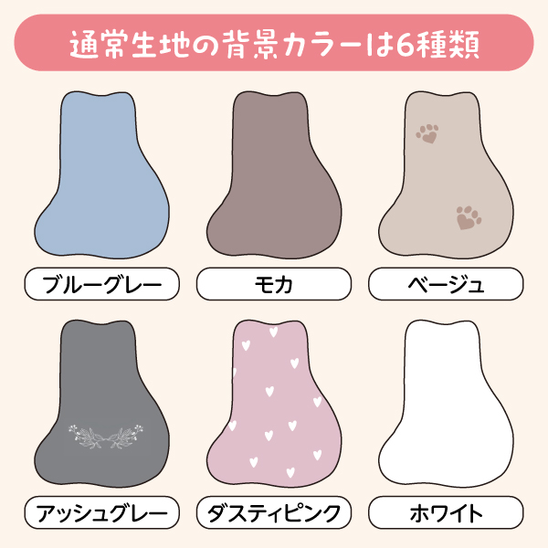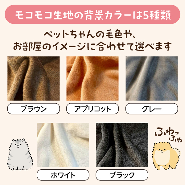 撥水性が高くお手入れしやすい「トロマット生地」、またはふわふわの肌触りでずっと触れていたくなる「モコモコ生地」を使用し、水に強く印刷が長持ちする昇華転写印刷により、品質にも気を遣い、1つ1つ心を込めてお作りします。
