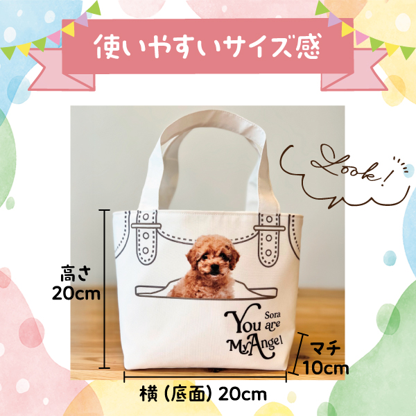 お手持ちの写真で作る、世界でひとつの『トートバッグ』。オモテ生地はトロマット生地、裏地は丈夫な帆布生地を使用してデザイン性と機能性を兼ね備えた万能トートバッグです。毎日のお出かけやランチを入れるバッグとしてもサイズ感ばっちりです。大きさは、横(底面)20㎝×高さ20㎝×マチ10㎝、持ち手30㎝です。